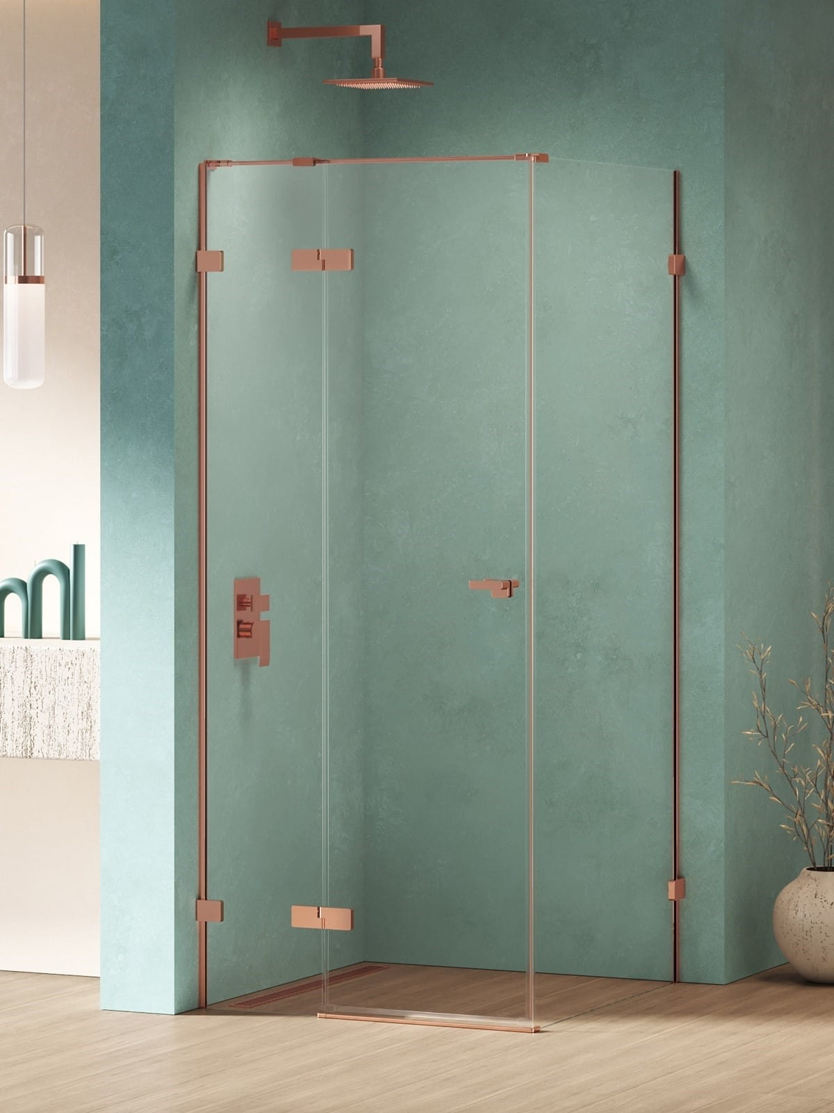 - Mosiężne detale w kolorze połyskliwej miedzi łączą w sobie funkcjonalność i elegancję. Zapewniają stabilność konstrukcji, zachowując przy tym minimalistyczny charakter kabiny.