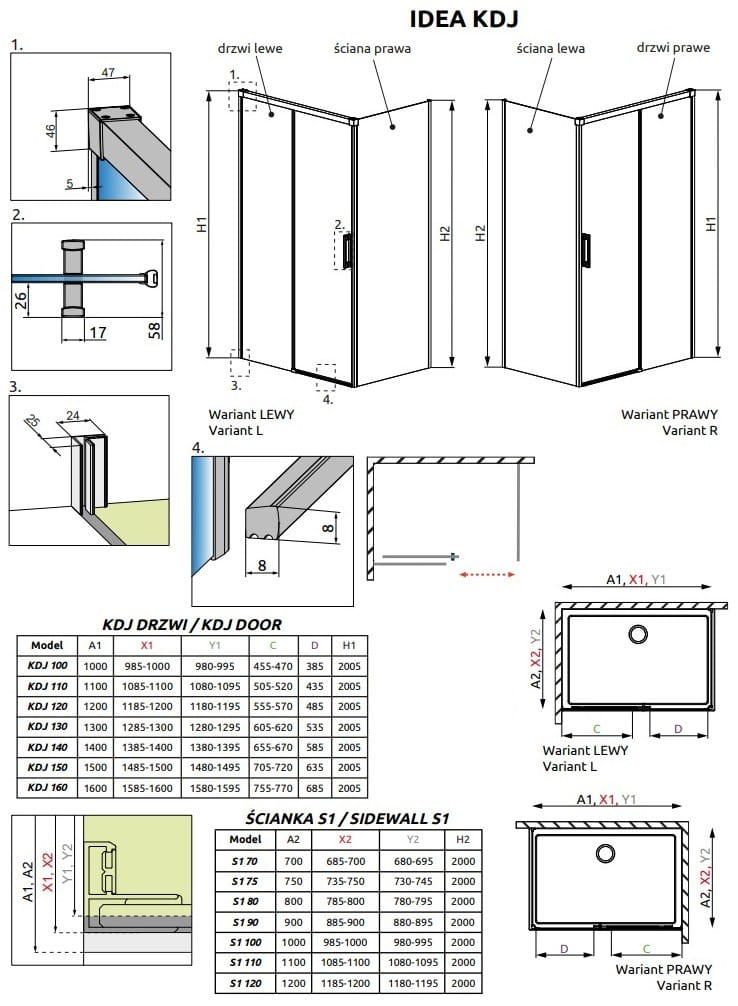 - Możliwość montażu bez listwy progowej: W standardzie otrzymują Państwo wszystkie komponenty potrzebne do montażu kabiny prysznicowej zarówno z listwą progową jak i bez listwy.