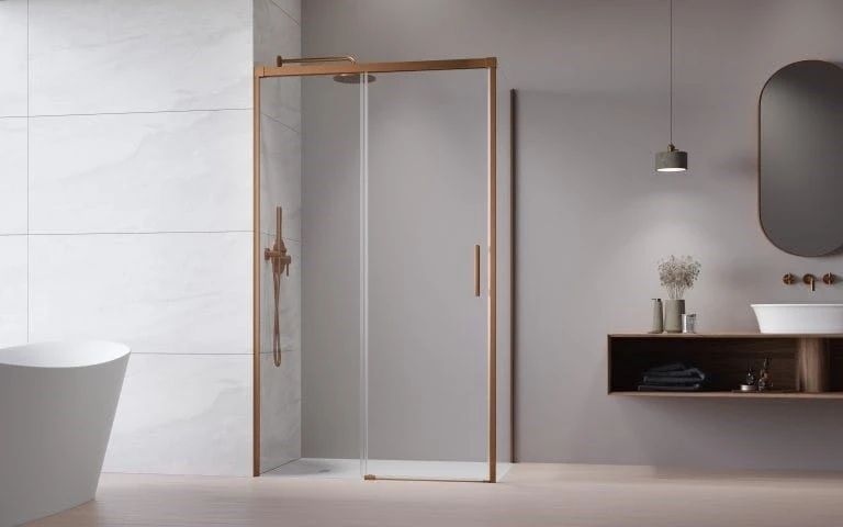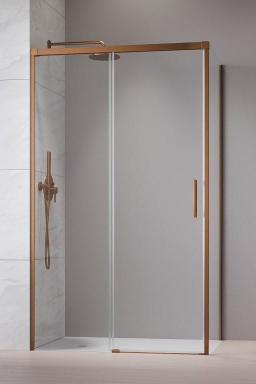 Kabiny Idea Brushed Copper KDJ to wynik designerskiego połączenia szkła z eleganckimi detalami w kolorze szczotkowanej miedzi – doskonale sprawdzą się we wnętrzu o minimalistycznym stylu , ale równie harmonijnie będą współgrać ze stylem klasycznym. Są to kabiny dla osób ceniących dobry design, które preferują geometryczne formy składające się w proporcjonalną całość.