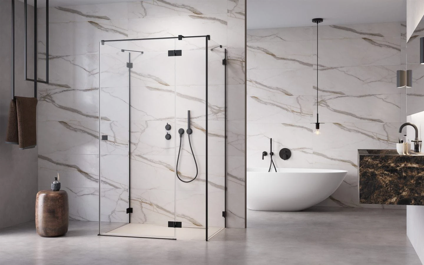 Kabiny Essenza Pro Black KDJ+S z modnymi detalami w kolorze czarnym zachwycają nowoczesnym designem, funkcjonalnością oraz przejrzystością konstrukcji. Modele z tej serii wpisują się w najnowsze trendy w wyposażeniu wnętrz. Montaż do ściany za pomocą systemu klamer nadaje kabinie lekkości, harmonijnie budując przestrzeń każdej łazienki.