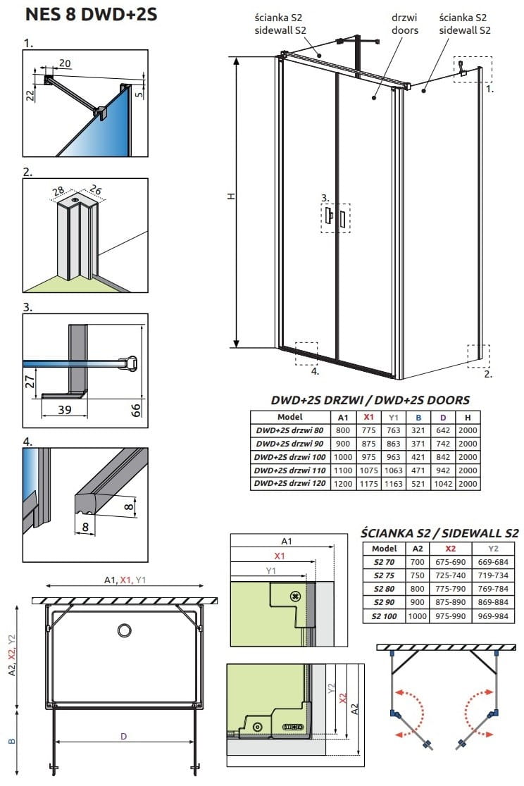 - Standardowo kabiny dopasowane są do montażu na brodziku o określonych wymiarach i właśnie te wymiary są podane w nazwie kabiny lub jej części. Rzeczywiste wymiary gabarytowe kabiny są nieco mniejsze od nominalnych podanych w nazwie artykułu. Jeśli planują Państwo montaż kabiny bezpośrednio na posadzce, proszę zwrócić uwagę na wymiary gabarytowe (X1, X2) oraz wymiary do osi szyby (Y1, Y2), które podane są na rysunku technicznym.