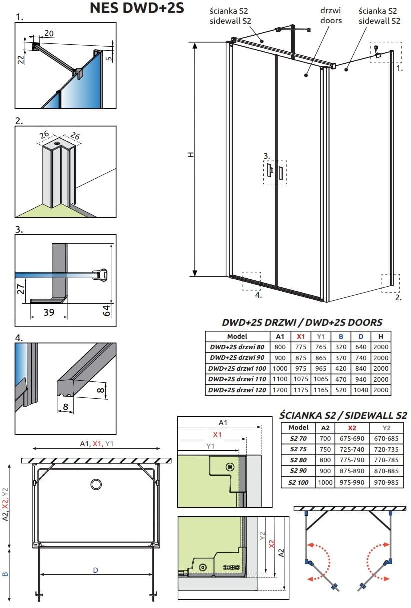- Standardowo kabiny dopasowane są do montażu na brodziku o określonych wymiarach i właśnie te wymiary są podane w nazwie kabiny lub jej części. Rzeczywiste wymiary gabarytowe kabiny są nieco mniejsze od nominalnych podanych w nazwie artykułu. Jeśli planują Państwo montaż kabiny bezpośrednio na posadzce, proszę zwrócić uwagę na wymiary gabarytowe (X1, X2) oraz wymiary do osi szyby (Y1, Y2), które podane są na rysunku technicznym.