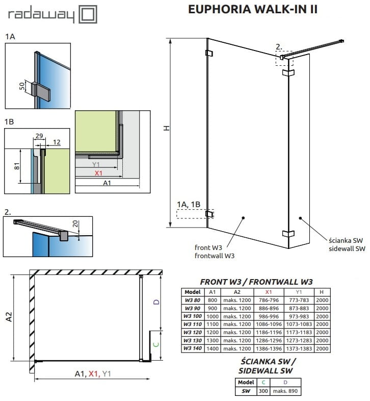 - Kabina składa się z dużego frontu i małej ścianki bocznej o szerokości 30 cm.