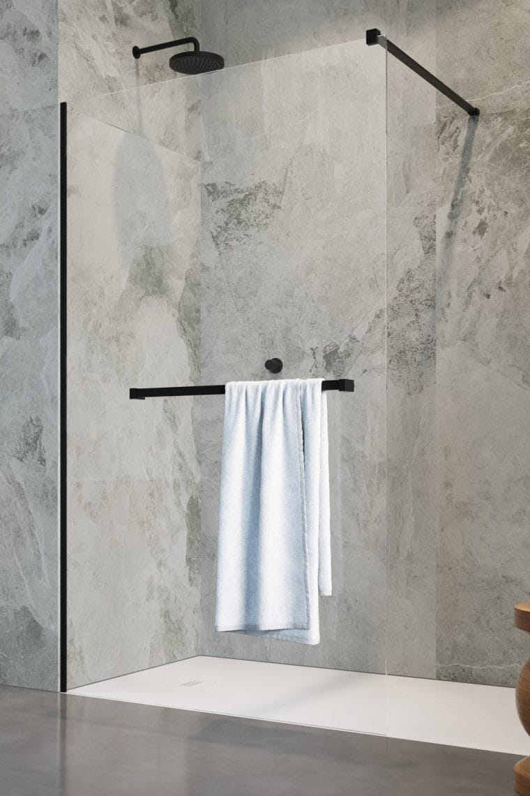 - Przedmiotem sprzedaży jest kabina typu walk-in (bezdrzwiowa) w szkle przejrzystym bez brodzika z czarnym wieszakiem na ręcznik.