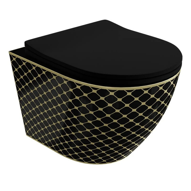 SOFI SLIM BLACK NIGHT to zaokrąglona bryła, wyróżniająca się czarną deską slim z uniesionym zakończeniem oraz fantazyjną miską WC o strukturze przeplatających się czarnych i złotych rombów. Stylowym elementem bryły jest harmonijna linia w złotym kolorze. Model idealnie sprawdzi się w eleganckich, paryskich oraz eklektycznych aranżacjach, tworząc niepowtarzalny efekt estetyczny. Miska wisząca SOFI SLIM BLACK NIGHT posiada standardowy rozmiar, więc możesz zrealizować szykowny projekt łazienki w każdym wnętrzu, niezależnie od jego wielkości.