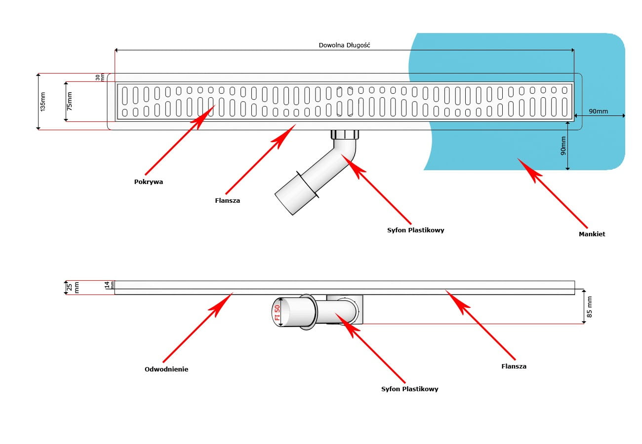 - szerokość odwodnienia z flanszą 135 mm