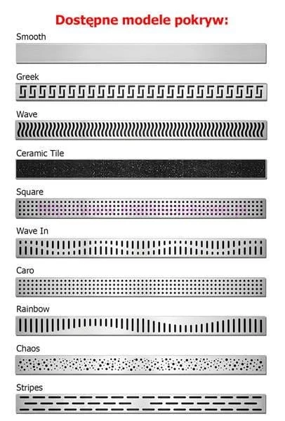 Zdjęcie główne odpływu liniowego jest poglądowe i nie zawsze ukazuje sprzedawany wzór rusztu (pokrywy). Proszę kierować się zdjęciem pokazującym wszystkie modele pokryw.