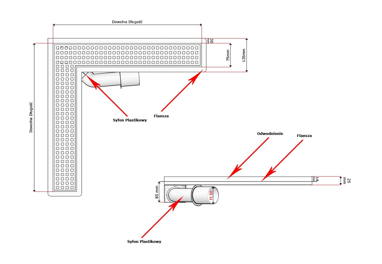 - szerokość odwodnienia z flanszą 135 mm