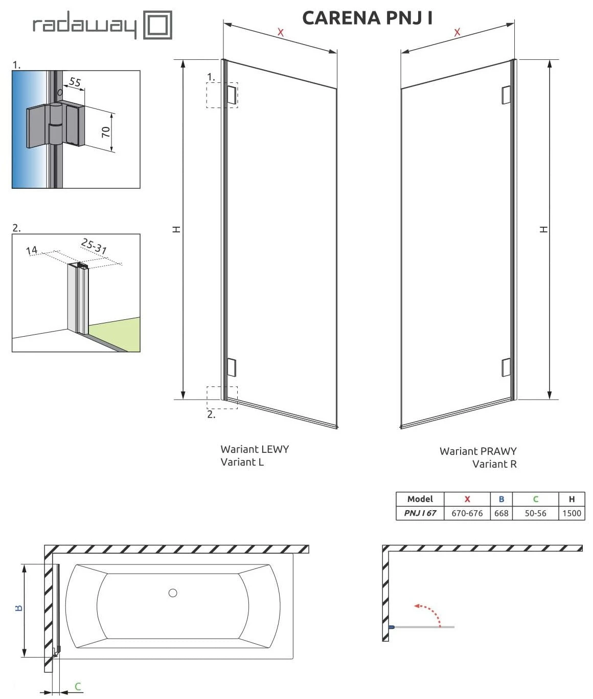 Parawan nawannowy Radaway Carena PNJ 67x150 lewy, szkło przejrzyste