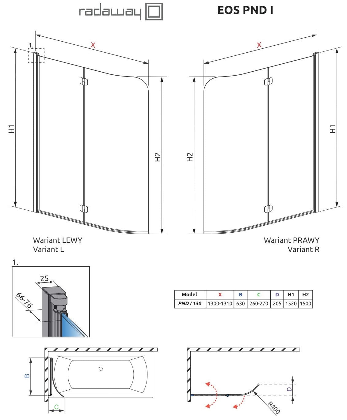 Parawan nawannowy RADAWAY Eos PND I 130x152 prawy, szkło przejrzyste