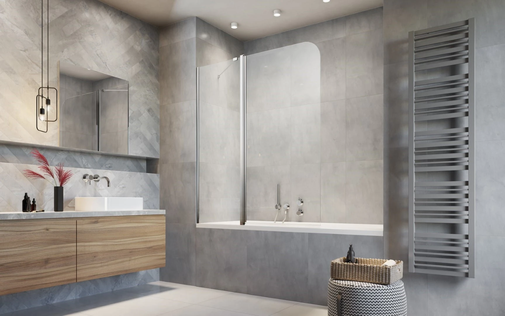 - Jedno skrzydło nieruchome mocowane na stałe do wanny, drugie skrzydło otwierane wahadłowo (do wewnątrz i na zewnątrz).