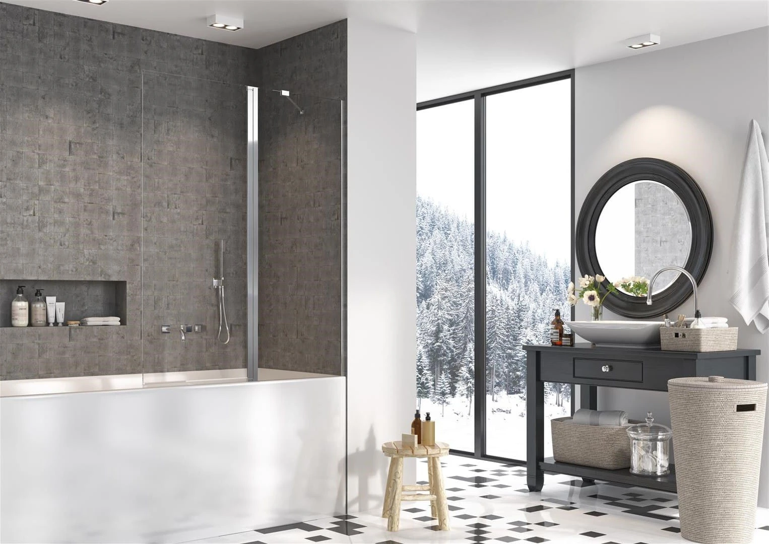 3) parawan z wieszakiem na ręcznik montowanym do szyby lub do szyby i ściany łazienki.