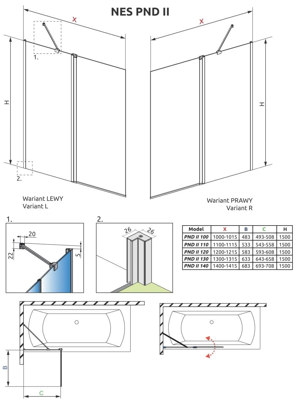 - Jedno skrzydło jest nieruchome (mocowane na stałe do wanny). Drugie jest uchylne do środka i na zewnątrz wanny.