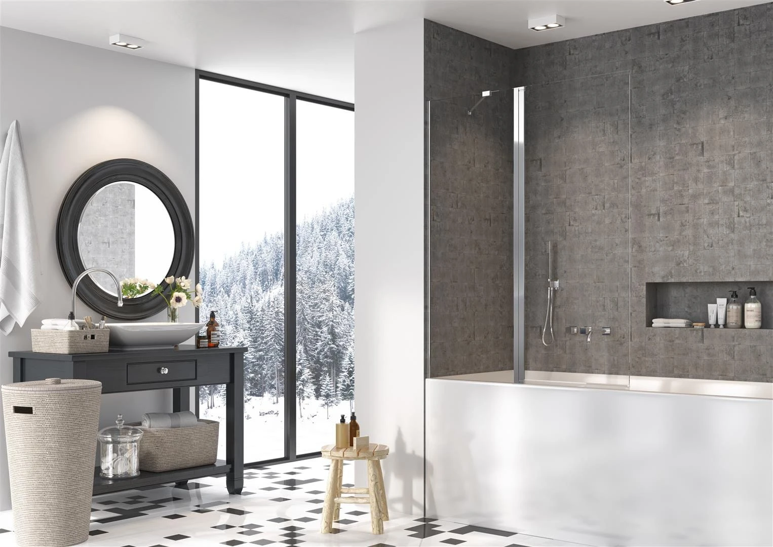3) parawan z wieszakiem na ręcznik montowanym do szyby lub do szyby i ściany łazienki.