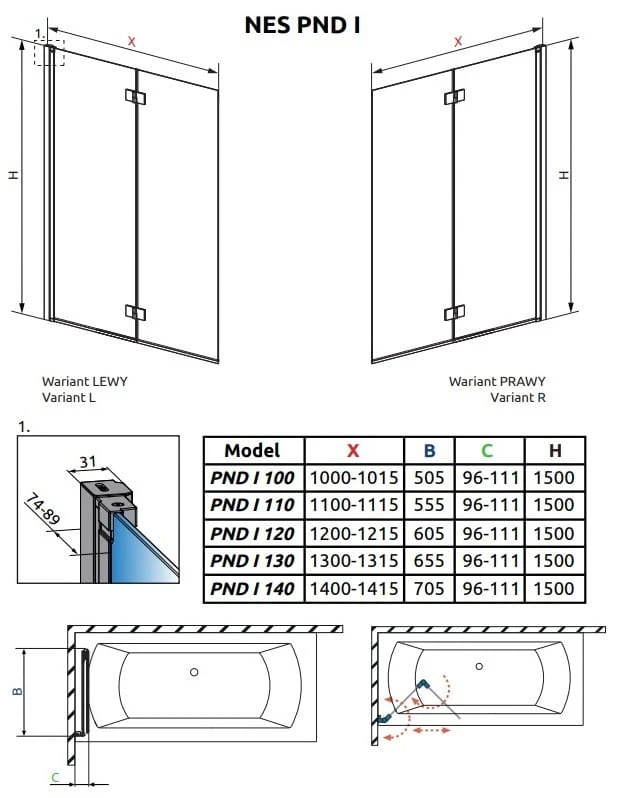 - Parawan dwuskrzydłowy składany do wewnątrz wanny.