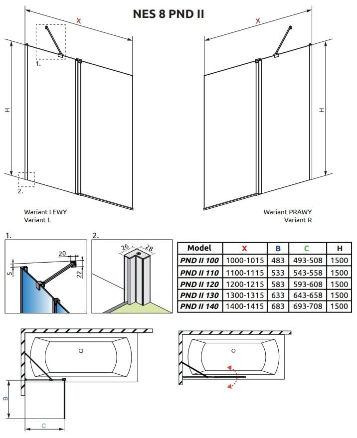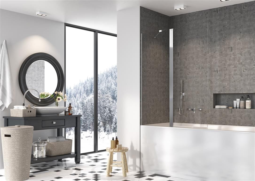 - Jedno skrzydło jest nieruchome (mocowane na stałe do wanny). Drugie jest uchylne do środka i na zewnątrz wanny.