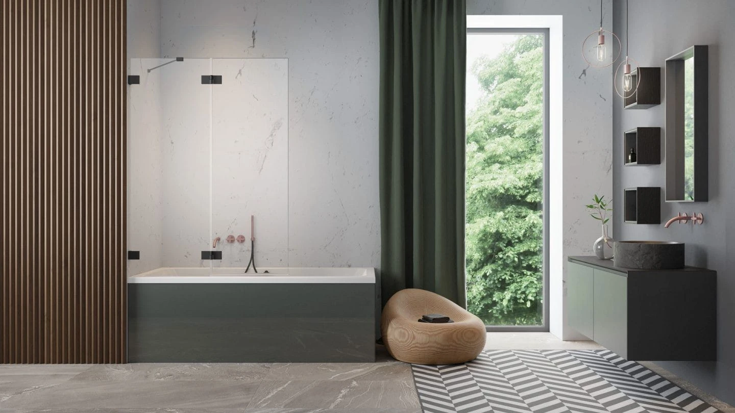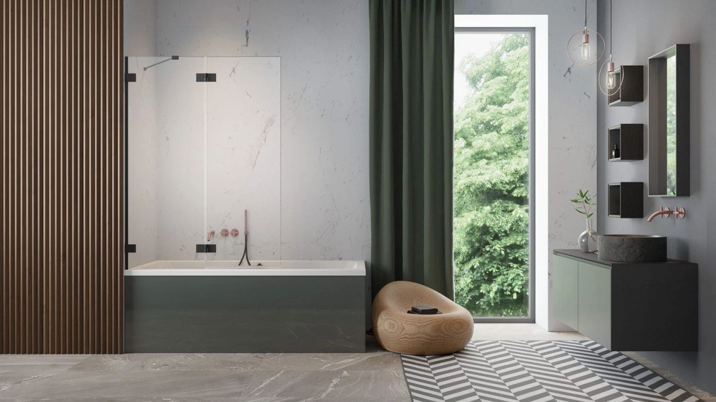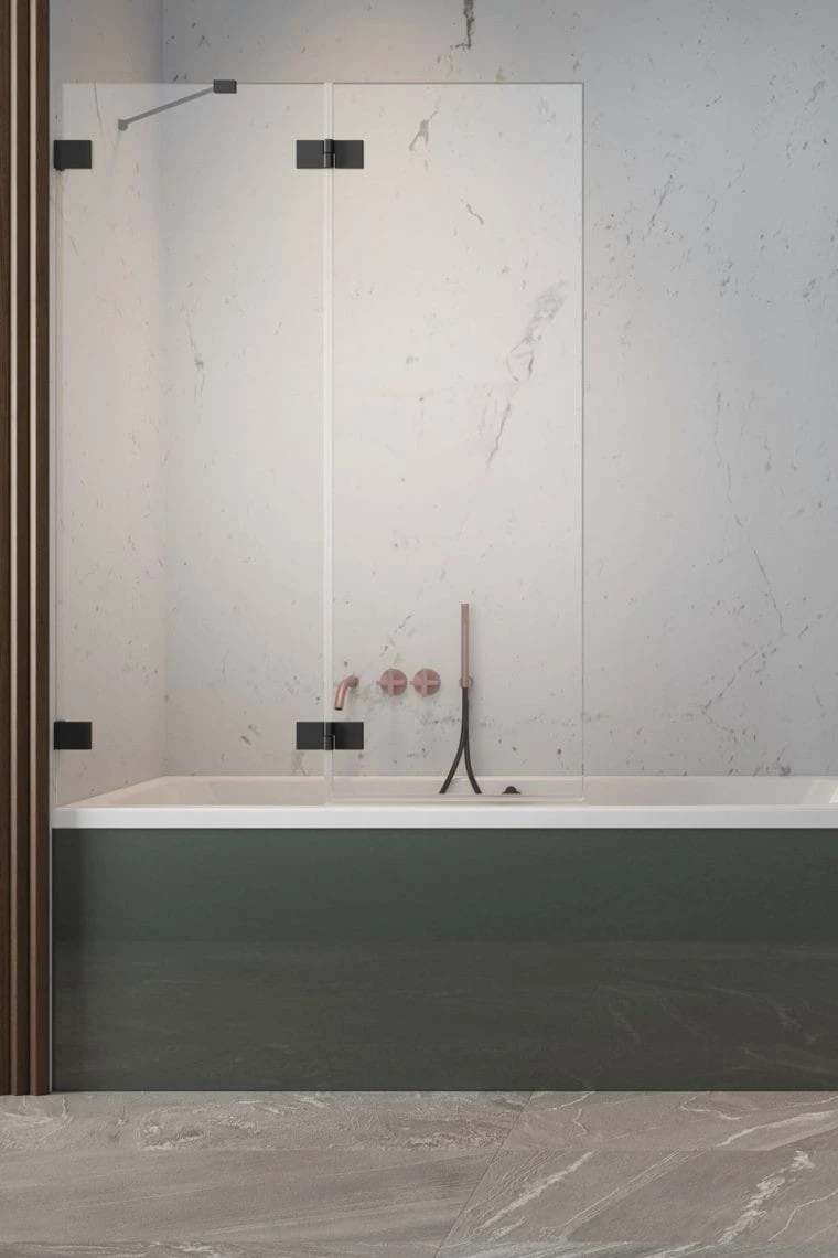 - Pierwsze skrzydło przy ścianie jest nieruchome, drugie skrzydło jest uchylne na zewnątrz wanny.