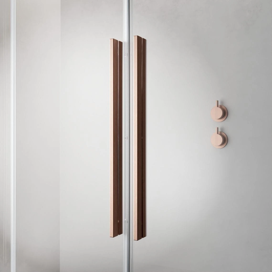 Seria Furo Brushed Copper to niespotykana dotąd jakość wśród przesuwnych parawanów prysznicowych. Dzięki rezygnacji z górnej prowadnicy i osadzeniu drzwi na rolkach uzyskaliśmy drzwi o niezwykłej elegancji, lekkości i przejrzystości. Rolki zostały zlicowane od wewnętrznej strony ze szkłem, ułatwiając utrzymanie parawanu w czystości. Przy otwarciu drzwi przesuwają się przed stały segment, dzięki czemu otrzymujemy przestronne i wygodne wejście.