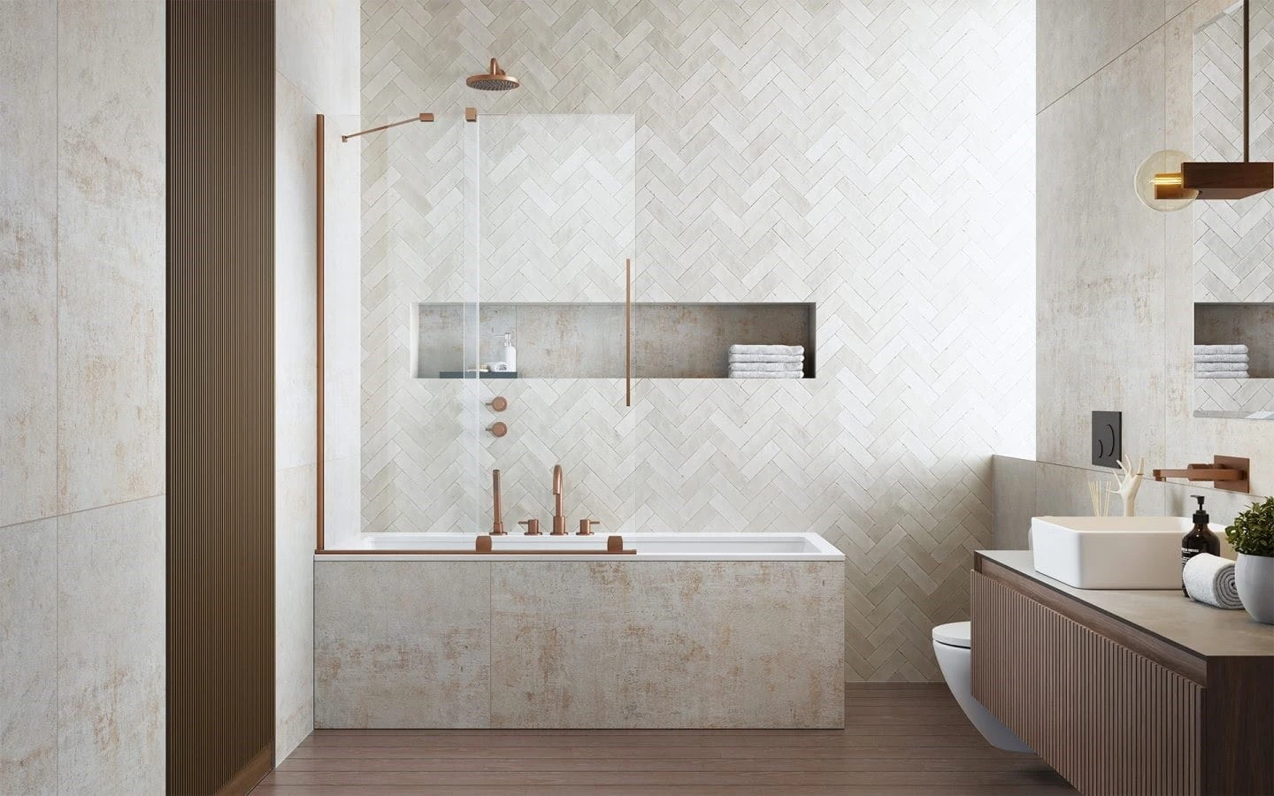 Parawan nawannowy Furo Brushed Copper PND II firmy Radaway w szkle przejrzystym z detalami w kolorze szczotkowanej miedzi.