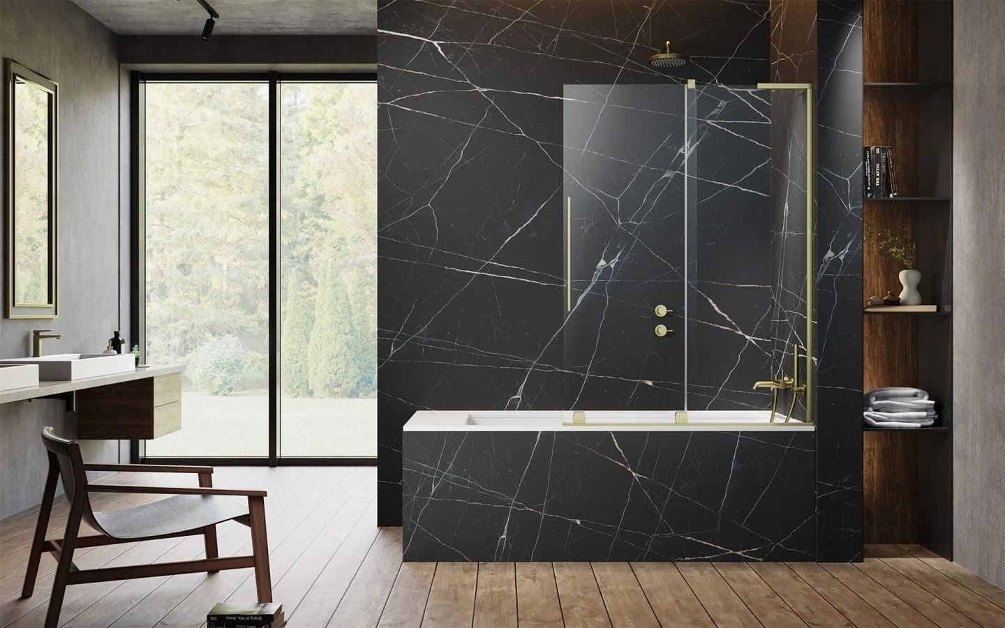 Parawan nawannowy Furo SL Brushed Gold PND II firmy Radaway w szkle przejrzystym z detalami w kolorze szczotkowanego złota.