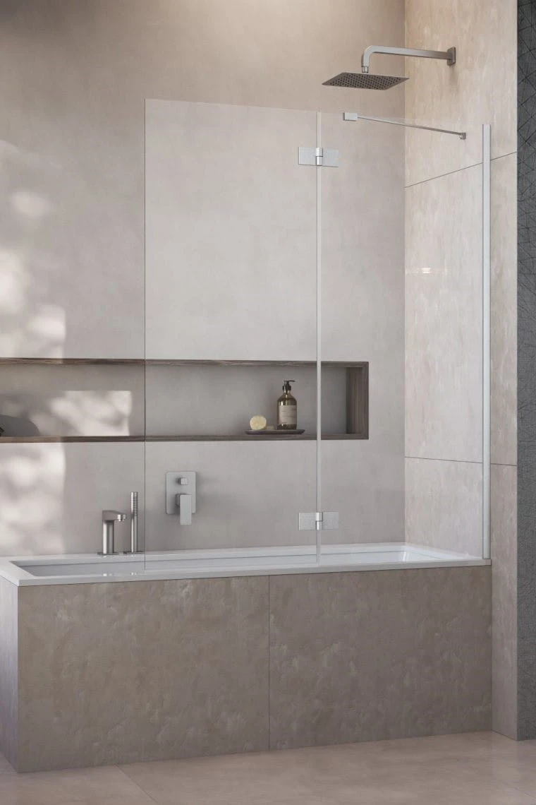 - Parawan dwuczęściowy. Jedna część jest montowana na stałe do wanny. Druga jest uchylna na zewnątrz wanny.