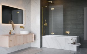 Parawan Essenza 8 SL Gold PND II wykonany ze szkła o grubości 8 mm z powloką Easy Clean ze złotymi detalami. W produkcie zastosowano nowoczesny stabilizator kątowy L.