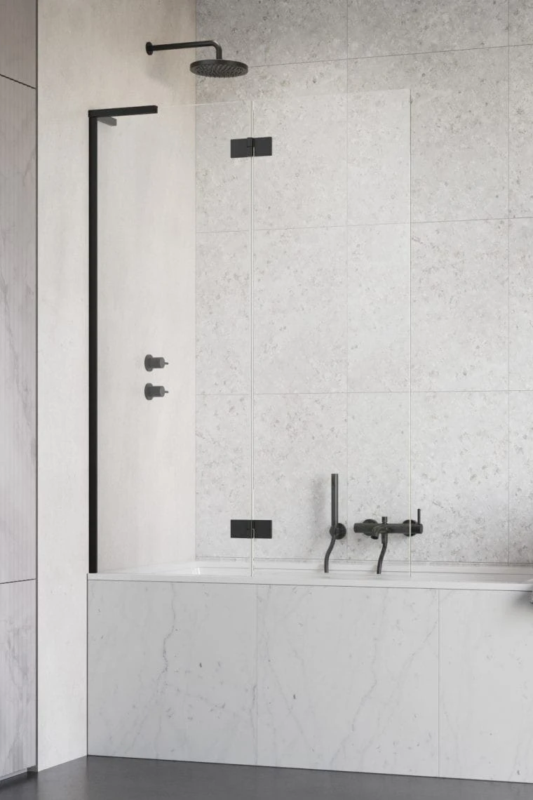 - Parawan dwuczęściowy. Jedna część jest montowana na stałe do wanny. Druga jest uchylna na zewnątrz wanny.