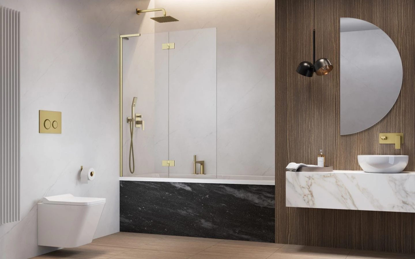 Parawan Essenza 8 SL Brushed Gold PND II wykonany ze szkła o grubości 8 mm z powloką Easy Clean z detalami w kolorze szczotkowanego złota. W produkcie zastosowano nowoczesny stabilizator kątowy L.