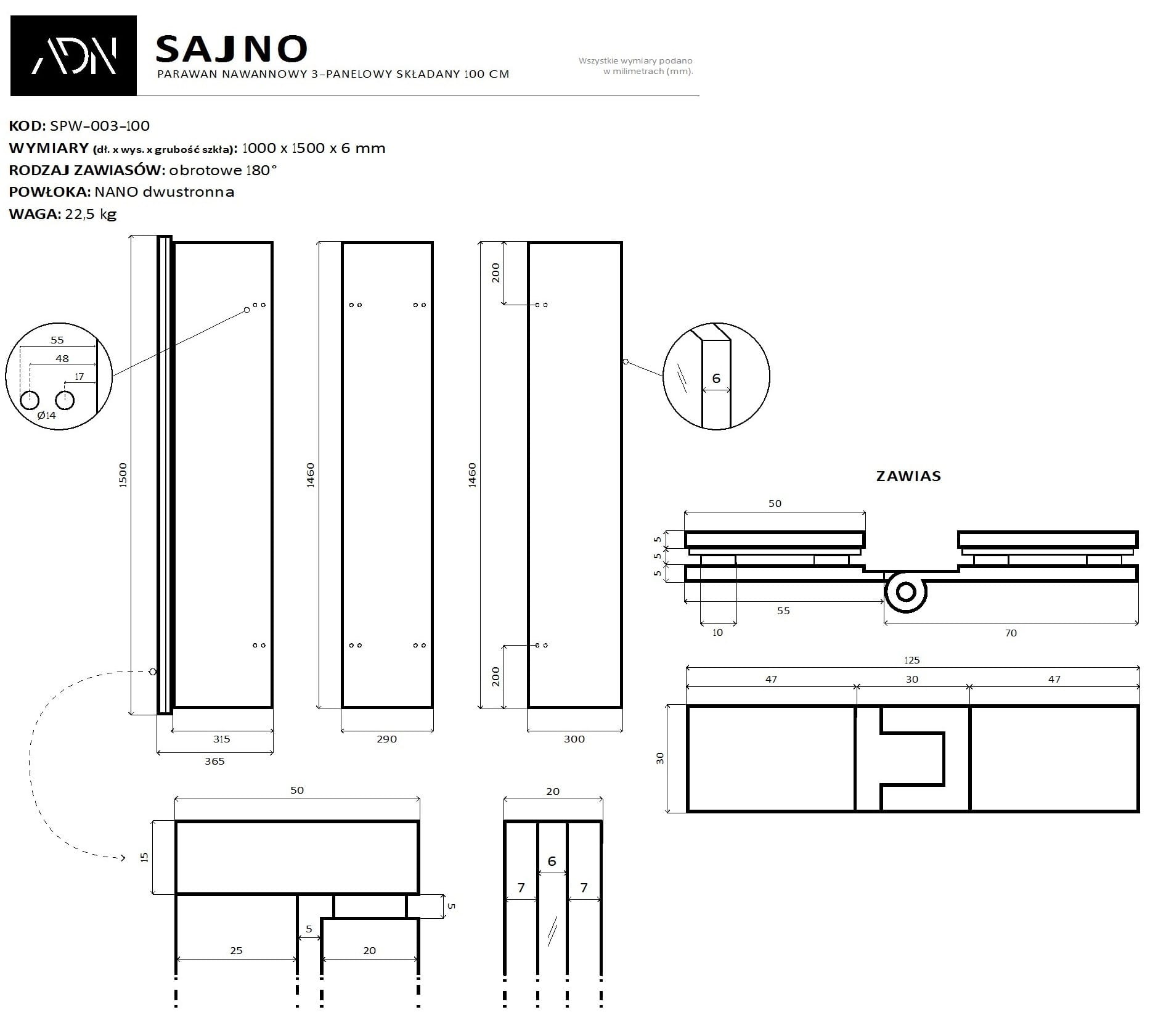 - Parawan składa się z 3 szklanych paneli, które łączą się za pomocą obrotowych zawiasów. Rozwiązanie to pozwala swobodnie składać parawan w harmonijkę na ścianę lub krótszy bok wanny, bez obaw o kolizję z baterią nawannową. Po złożeniu parawan zajmuje minimalną przestrzeń, co sprawia, że idealnie nadaje się do niewielkich łazienek.