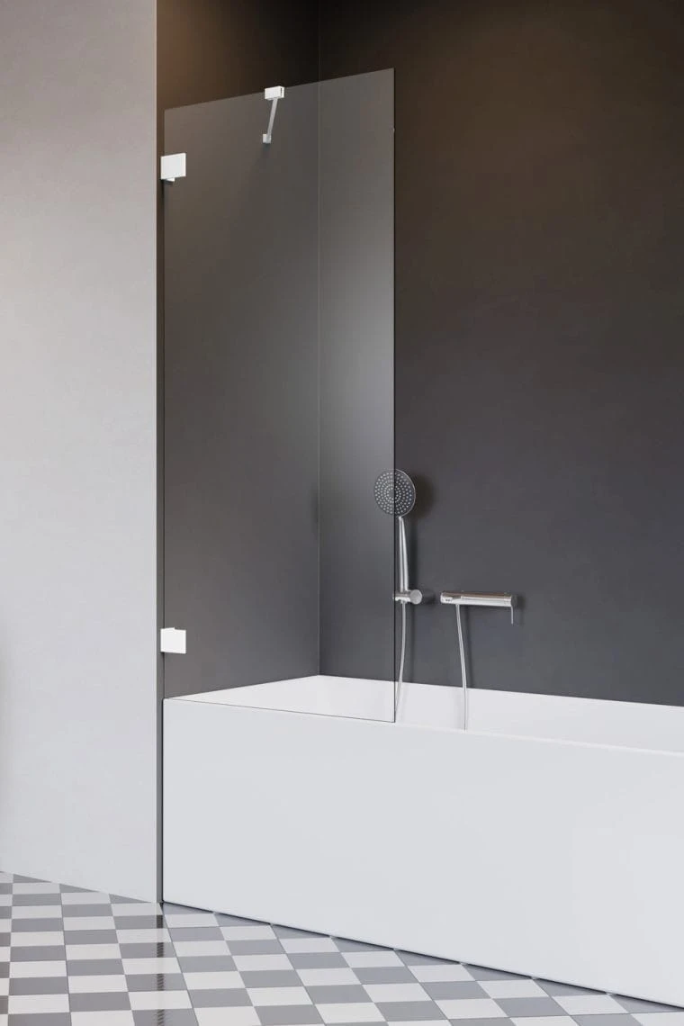 Parawan nawannowy jednoczęściowy nieruchomy Essenza Pro White PNJ II w szkle przejrzystym z detalami w kolorze białym.