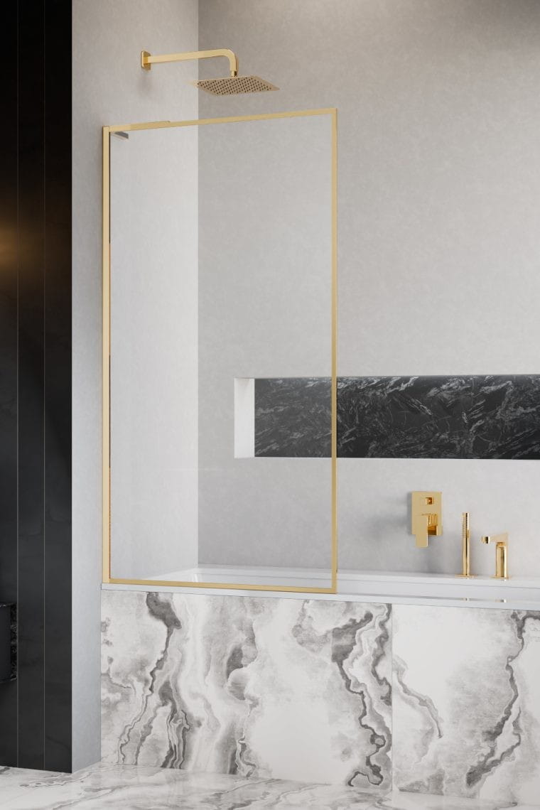Parawan nawannowy Modo F SL Gold PNJ II firmy Radaway w ozdobnej ramie, ze stabilizatorem kątowym L w złotym kolorze.