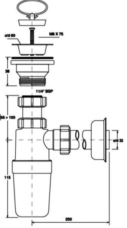 Syfon umywalkowy butelkowy 1.1/4″x32mm z sitem ze stali nierdzewnej i korkiem gumowym.