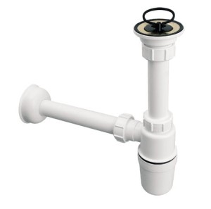 Syfon umywalkowy butelkowy z sitem ze stali nierdzewnej i korkiem gumowym.