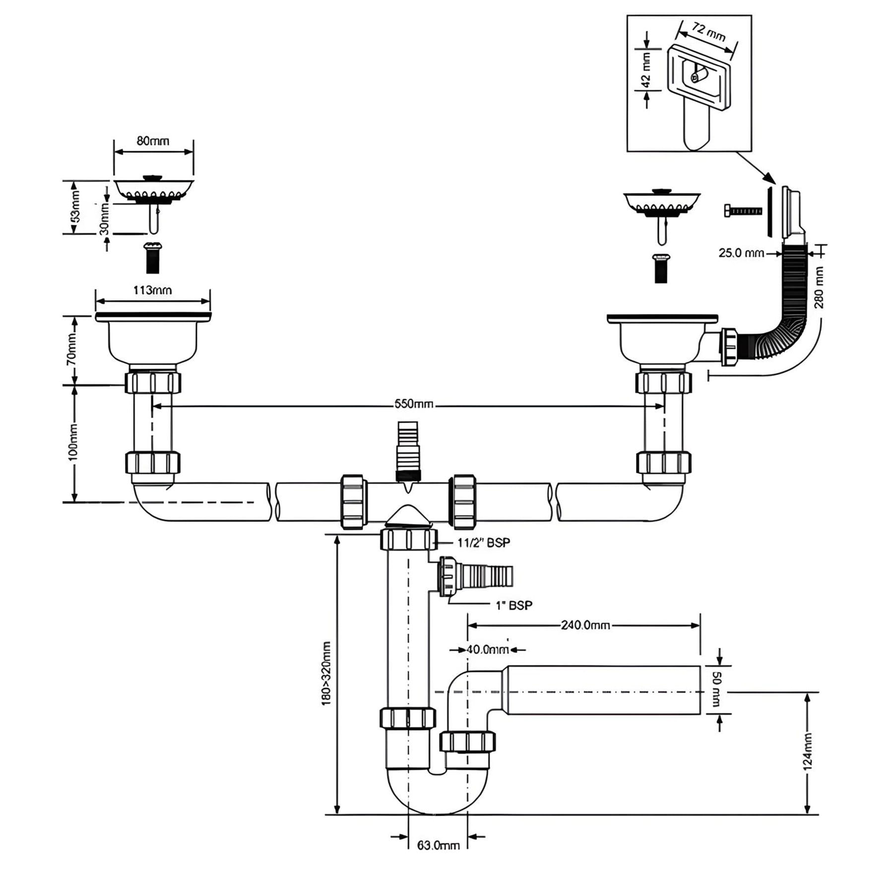Syfon zlewozmywakowy podwójny rurowy ze spustami z podłączeniem do pralki i zmywarki z przelewem ujściem prostokątnym do ociekacza.