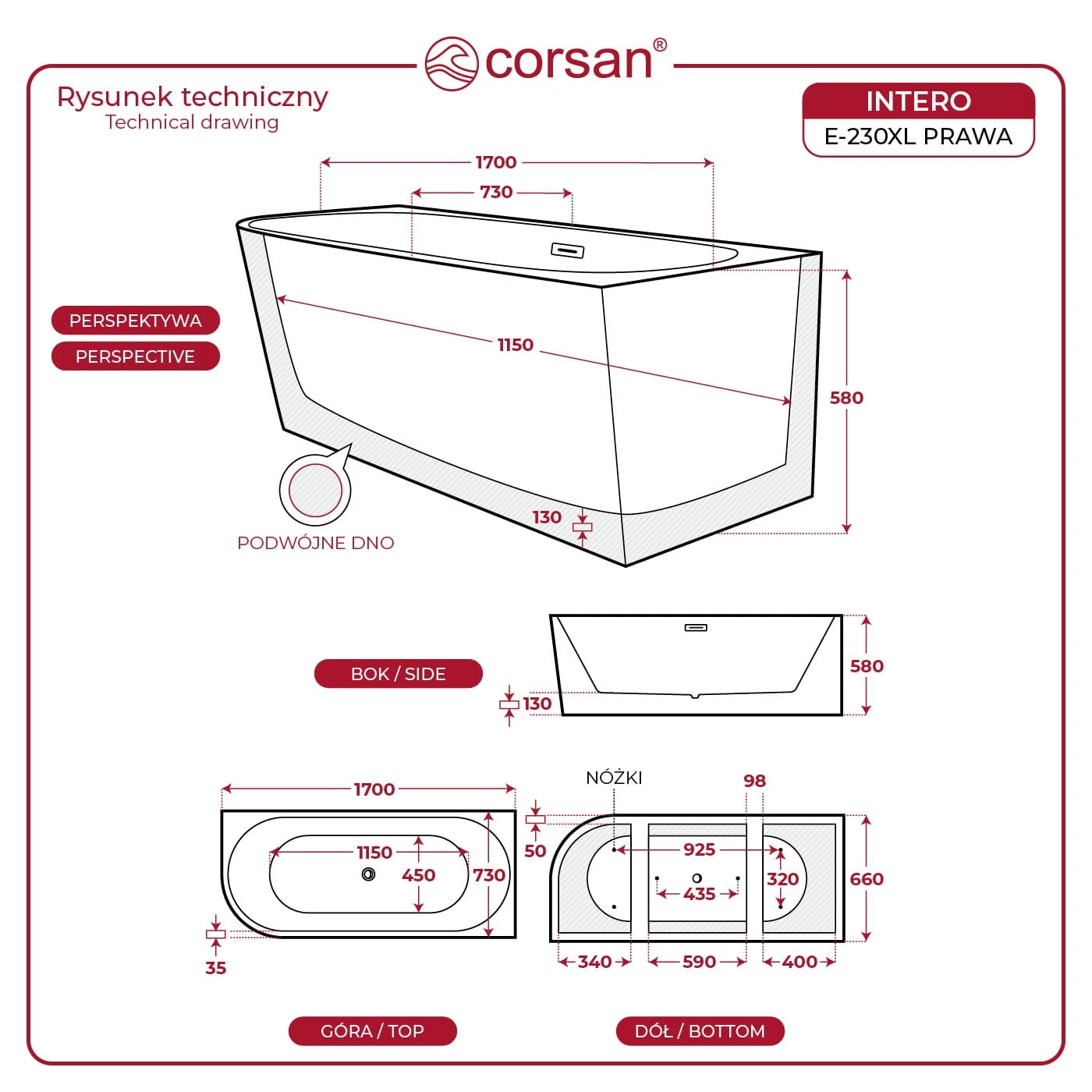 Wanna wolnostojąca narożna corsan intero 170 x 73 montaż prawostronny korek klik-klak szczotkowane złoto