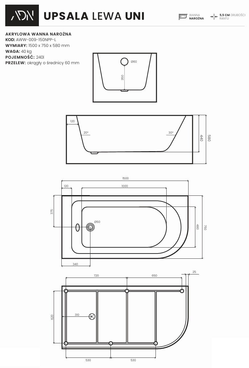 Wanna narożna UPSALA UNI lewa 150x75 AD NATURALNIE