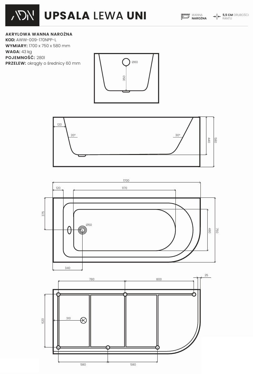 Wanna narożna UPSALA UNI lewa 170x75 AD NATURALNIE