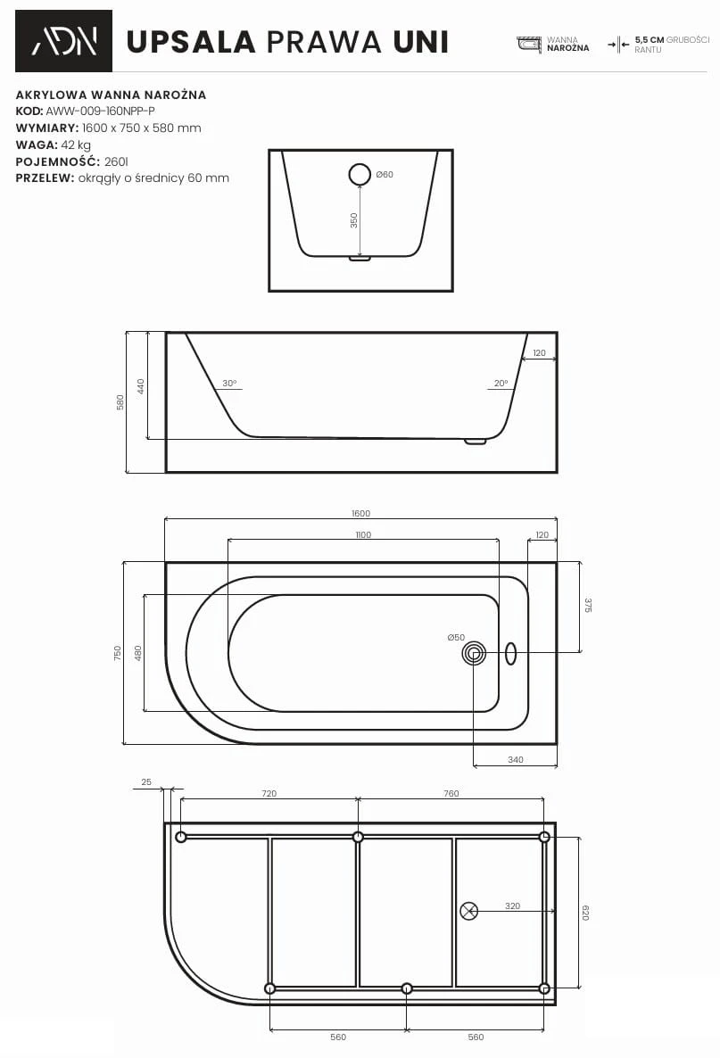 Wanna narożna akrylowa UPSALA UNI prawa 170x75 AD NATURALNIE