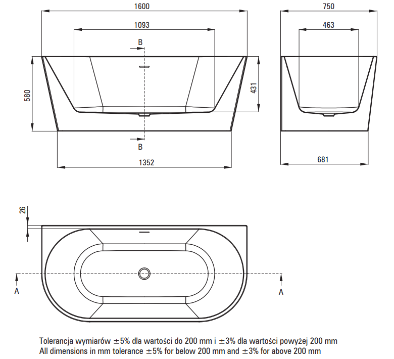 Wanna akrylowa przyścienna/wolnostojąca 160 cm Silia Deante
