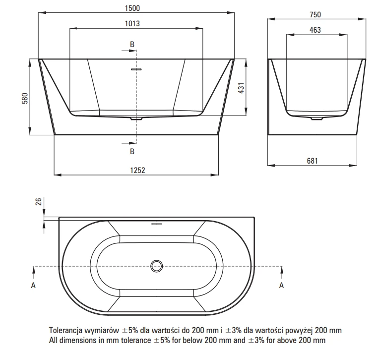 Wanna akrylowa przyścienna/wolnostojąca 150 cm Silia Deante