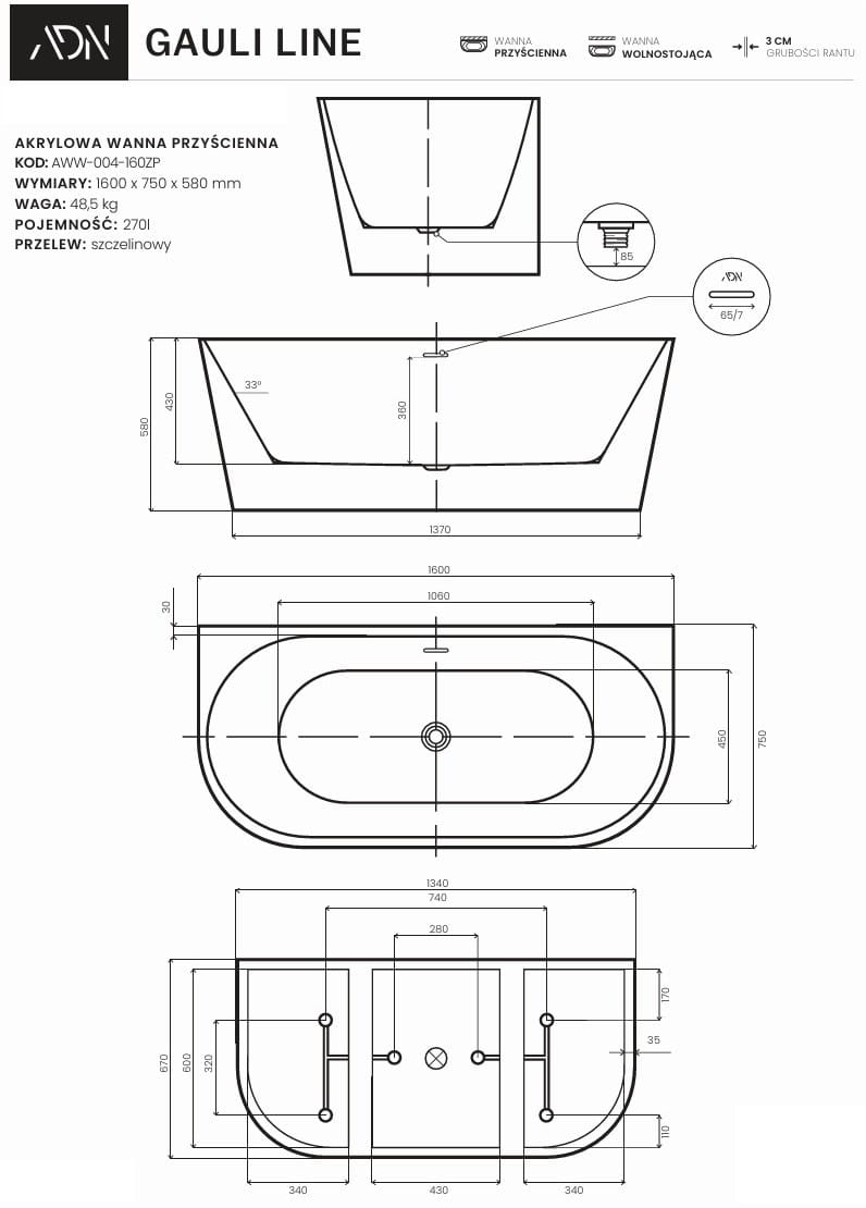 Wanny marki AD są solidne, wykonane z grubego akrylu najwyższej jakości, który z pewnością nie będzie się odkształcał. Sprzedawane są w komplecie z eleganckim korkiem klik-klak, z elastyczną rurą odpływową oraz stelażem wzmacniającym do poziomowania. Dodatkowo, wszystkie wanny mają wzmocnione dno.
