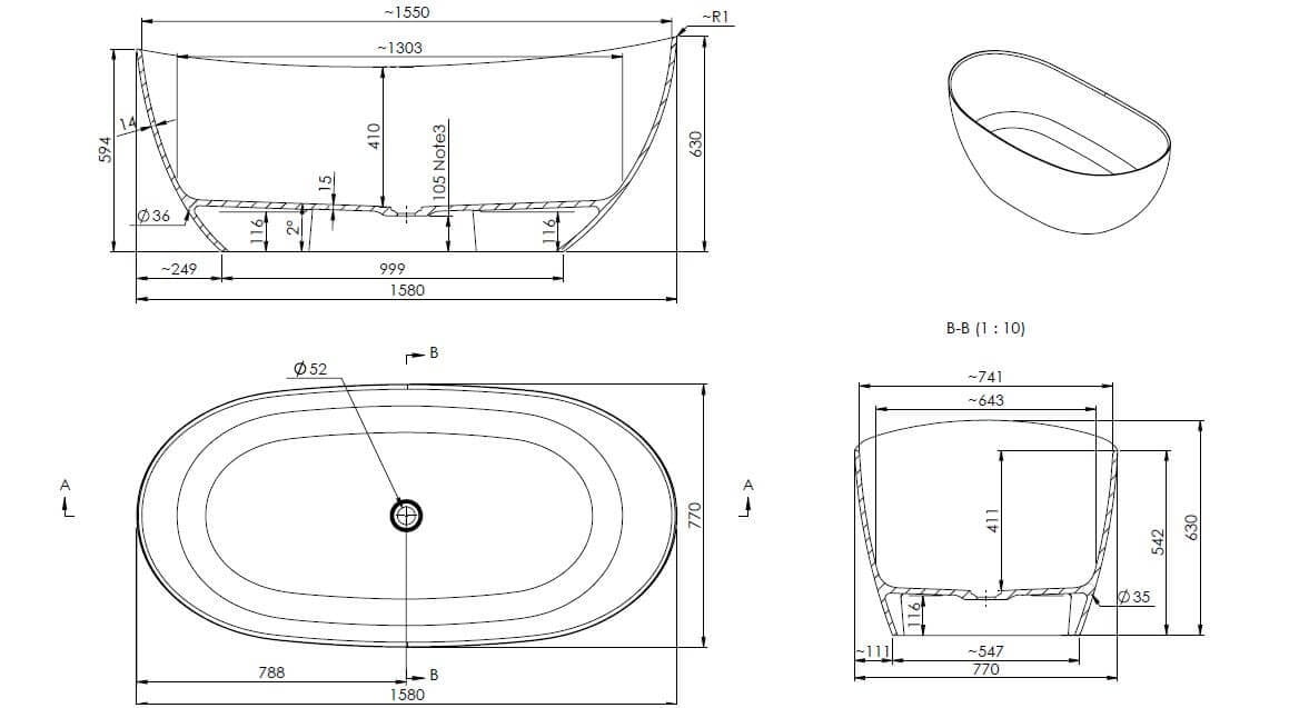 Wanna wolnostojąca, kompozytowa,158x77x63 cm, bez przelewu, z syfonem, powłoka SNOW WHITE.