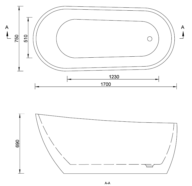Wanna wolnostojąca, akrylowa,170x75x69 cm, z przelewem szczelinowym, z syfonem, biały połysk