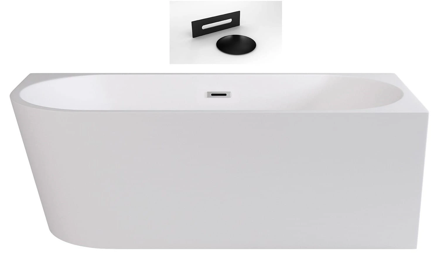 Wanna wolnostojąca przyścienna Besco Zoya 150x75 prawa o pojemności 210 litrów. W komplecie z wanną są syfon klik-klak z przelewem i czarne maskownice.