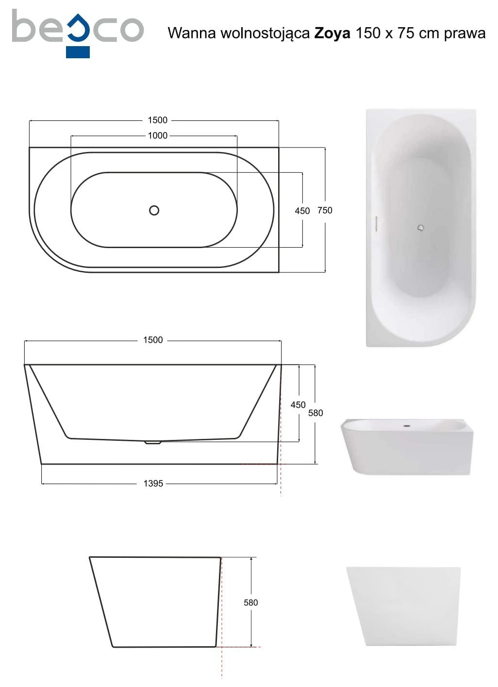 Wanna wolnostojąca Zoya Besco 150x75 prawa biała maskownice czarne