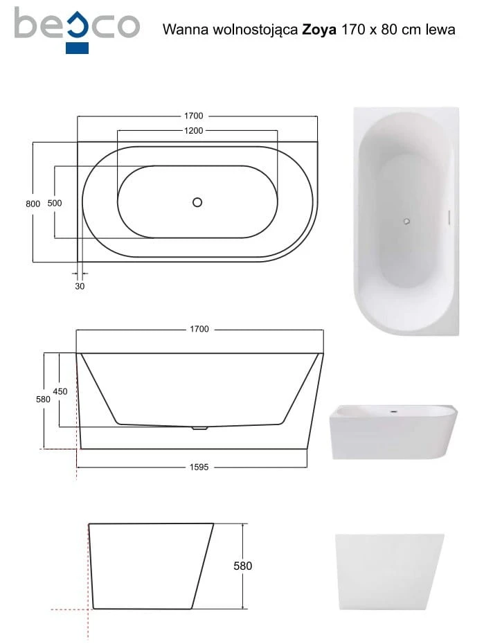 Wanna wolnostojąca przyścienna Besco Zoya 170x80 lewa o pojemności 250 litrów.