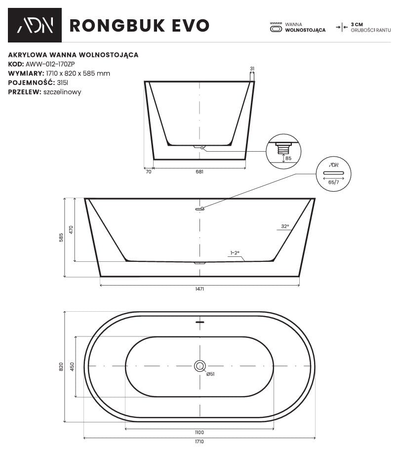 Wanna wolnostojąca Rongbuk Evo 171x82 biała AD NATURALNIE