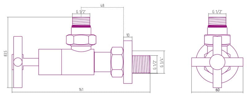Długość zaworu w części przyłączeniowej jest dostosowana do długości mocowań grzejnika, dzięki czemu podłączenia do rur systemu ogrzewania nie są widoczne, rury nie wystają ze ściany. Każdy zawór ma rozetkę maskującą w kolorze zaworu, przejściówkę-mimośród 3/4-1/2", uszczelkę silikonową.