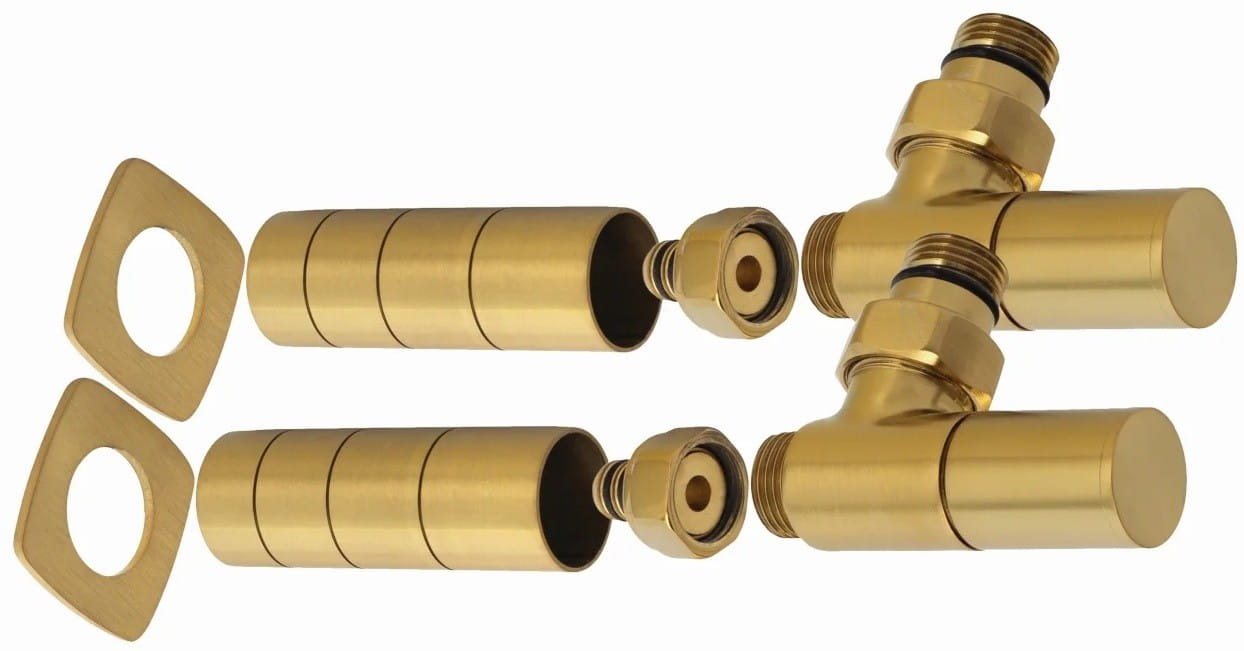 Zestaw zaworów kątowy Round M z rurką maskującą firmy Sunerzha w kolorze szczotkowanego złota. W komplecie złączki Pex.