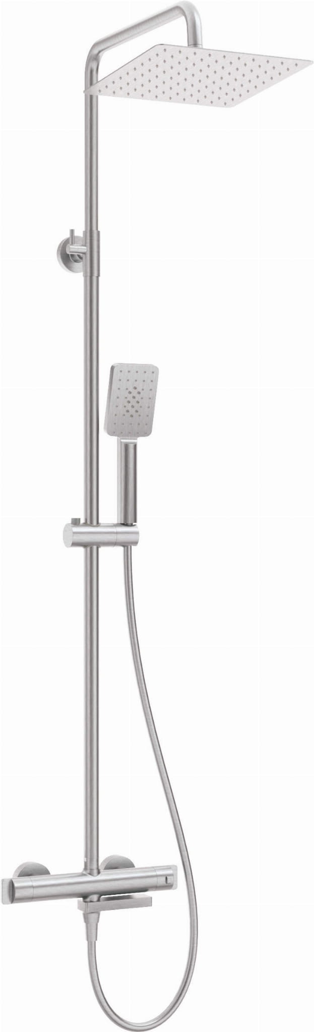 Deszczownica z baterią wannową termostatyczną firmy Deante w wykończeniu szczotkowanej stali.